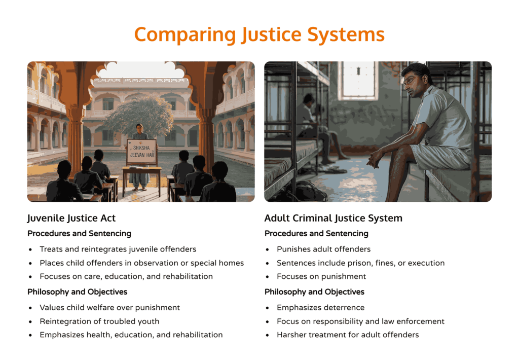 It has been observed, for example, that when a 16-year-old is apprehended for theft committed under the burden of socioeconomic stress, they are processed not through the adult criminal justice system but through mechanisms such as observation homes. This divergence in treatment exemplifies how juvenile justice principles differ significantly from adult criminal prosecution.