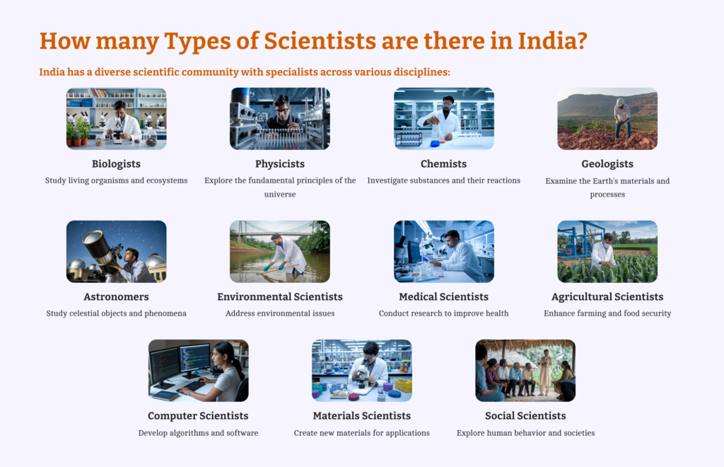 These categories represent just a few specializations within the scientific community in India. Each type of scientist plays a crucial role in advancing knowledge and technology in their respective fields.