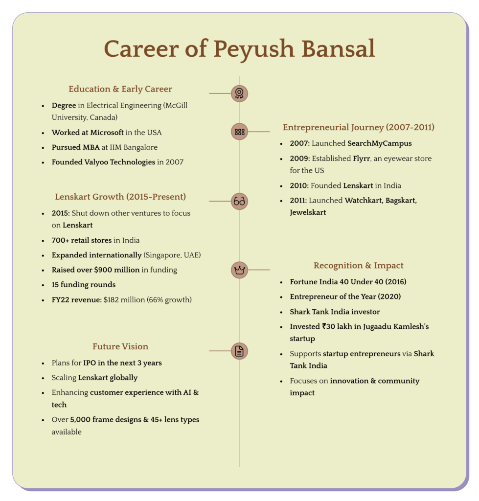 These facts illustrate Peyush Bansal’s significant impact on the eyewear industry and his growing influence in the entrepreneurial ecosystem in India.