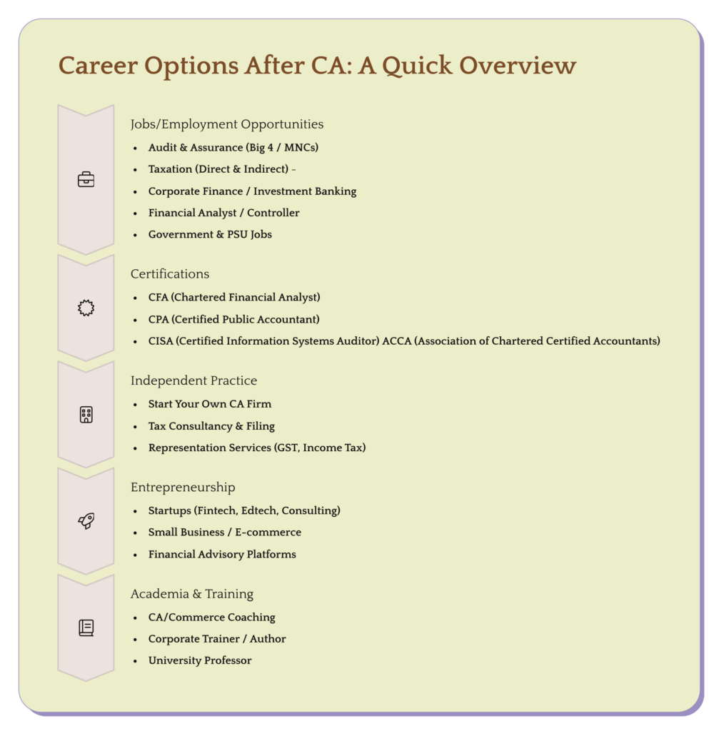 After clearing all three levels of CA-CPT/CA Foundation, IPCC/CA Intermediate, and CA Final-you might feel overwhelmed with choices. The keyword question, “What to do after CA?” often involves understanding what aligns best with your skills and aspirations. Let’s break down the primary paths you can consider: