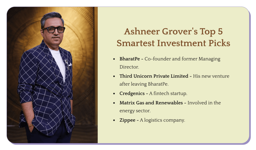 Ashneer Grover has made several strategic investments across various sectors: