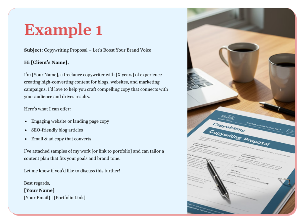 A proposal writing example is a structured document where a freelancer outlines their understanding of a client’s needs, suggests solutions, shares relevant experience, and includes pricing and timelines aimed at convincing the client to hire them.