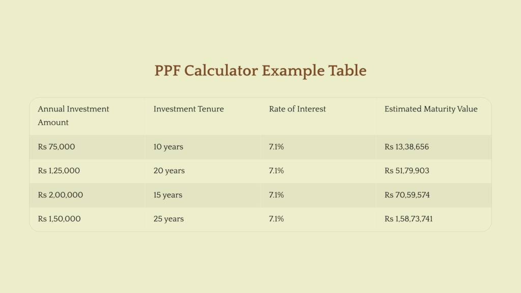 The formula used by a PPF calculator is similar to the one used to find the future value of an annuity. In simple terms, it figures out how much your regular contributions will grow over time, based on the annual investment you make and the interest rate set for the PPF scheme.