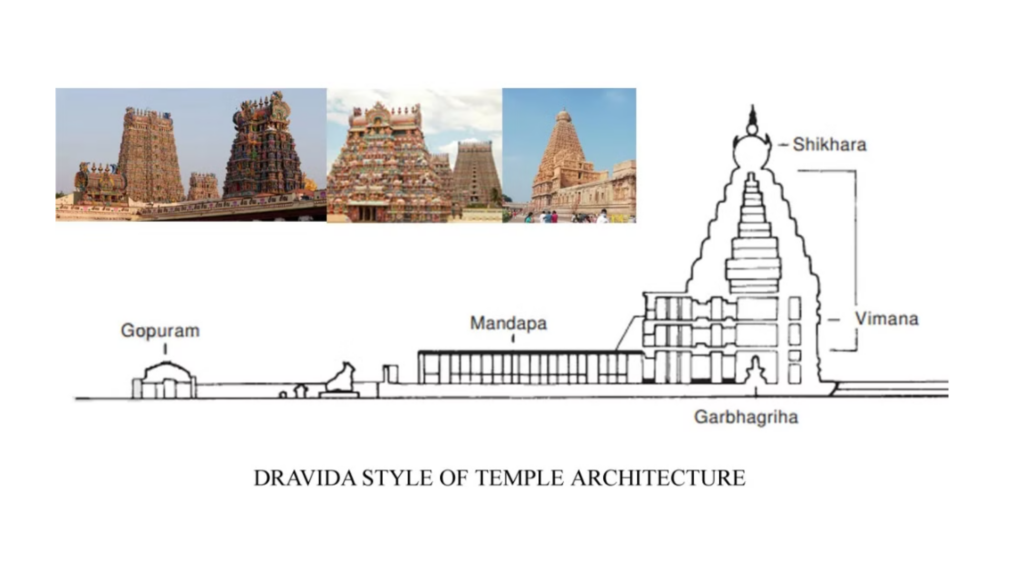 South Indian architecture is distinguished by its towering gopurams and expansive temple complexes. The Dravidian style began in the Pallava period and flourished under the Cholas and Pandyas. It is epitomized by the Brihadeeswarar temple in Thanjavur, which has elaborate sculptures and a towering vimana.