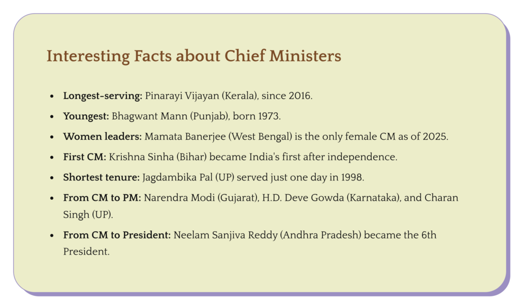 These interesting facts highlight the diversity, talent, and leadership qualities among India’s Chief Ministers. Including such insights adds uniqueness and value for readers, quiz enthusiasts, and competitive exam aspirants, making remembering notable leaders and their contributions easier.