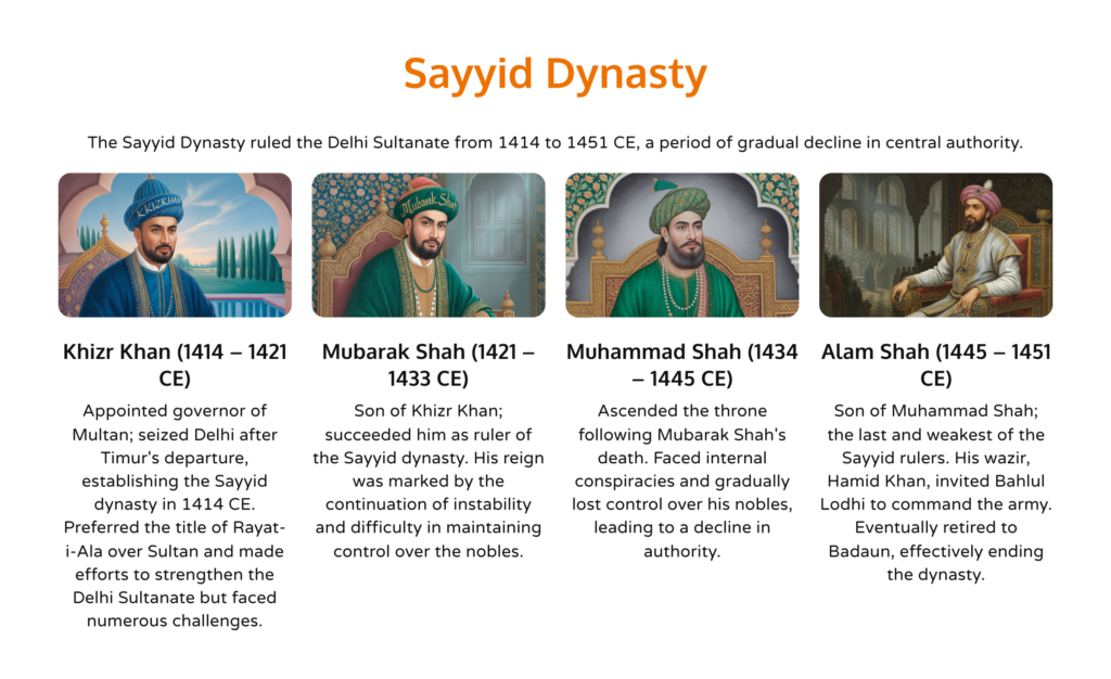Weak successors of Timur’s invasion. Founded by Khizr Khan, but largely insignificant in expansion or administration.