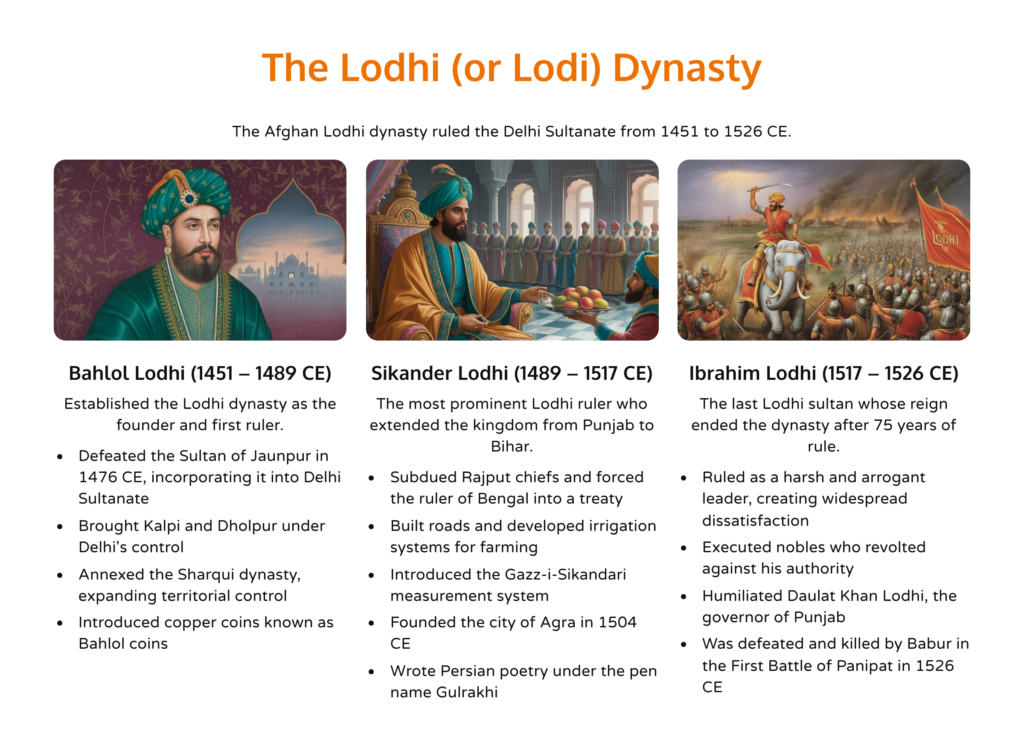 The Lodhi dynasty was the last to rule during the Sultanate period and the first Afghan-led dynasty. They initially governed Sirhind while the Sayyids ruled in Delhi.