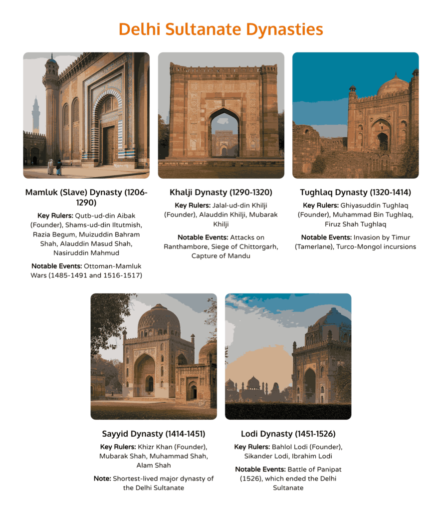 The Delhi Sultanate (1206–1526) was ruled by five major dynasties that shaped medieval Indian history. These were the Mamluk (Slave) Dynasty (1206–1290), the Khilji Dynasty (1290–1320), the Tughluq Dynasty (1320–1414), the Sayyid Dynasty (1414–1451), and the Lodi Dynasty (1451–1526). Together, they expanded Islamic rule across North India, introduced new administrative systems, and influenced art, architecture, and culture, laying the foundation for the Mughal Empire.