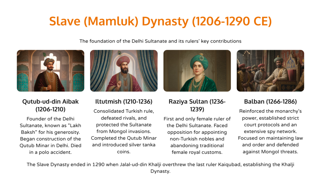 Mamluk Dynasty was founded by Qutb-ud-din Aibak, followed by rulers like Iltutmish and Balban. Known for consolidating power and building Qutub Minar.