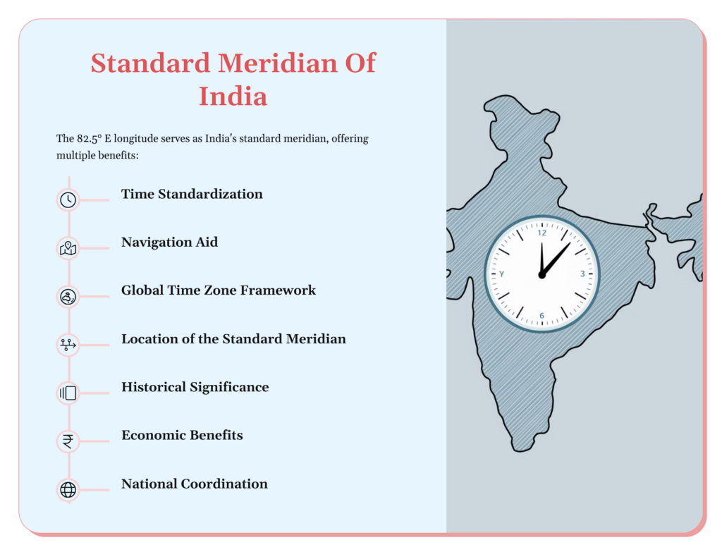 The Standard Meridian of India ensures time uniformity, aids navigation, strengthens economic activities, and fosters seamless national and international coordination. The standard meridian of India, located at 82.5° East longitude, plays a crucial role in various aspects of the country’s functioning. Here are some key points highlighting its importance: