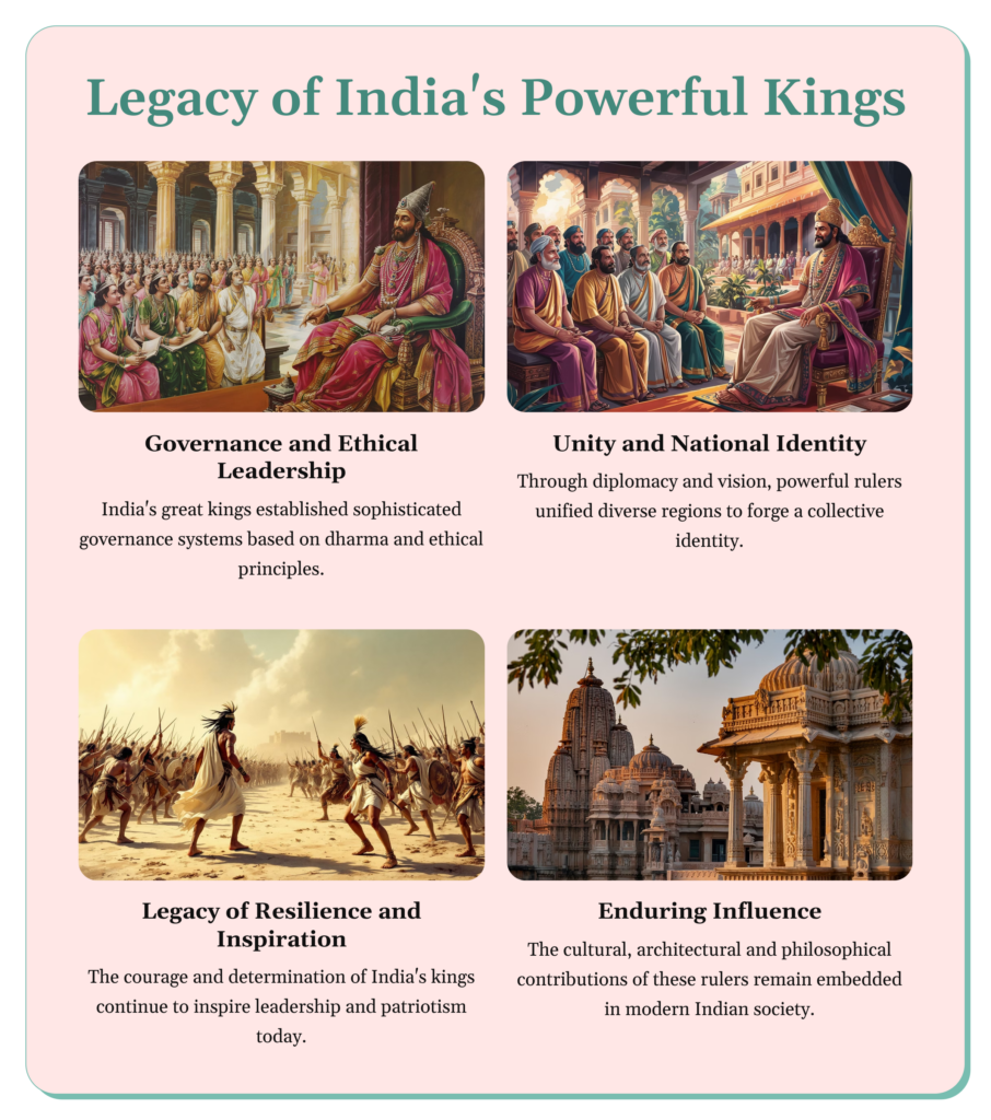 From Ashoka’s Buddhist compassion to Shivaji’s military brilliance and Akbar’s visionary administration, India’s kings have left legacies shaping the subcontinent’s identity. Each ruler uniquely contributed to Indian civilization. Ashoka promoted peace and tolerance; Akbar united through diplomacy; Shivaji resisted imperial powers with decentralized rule; and Raja Raja Chola expanded maritime influence and culture. These figures are among the top 10 powerful kings in India, known for their leadership and lasting impact.