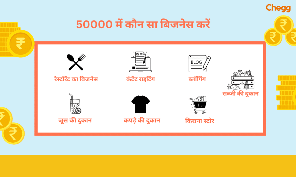 इस लेख में हम आपको 15 ऐसे टॉप बिजनेस आइडियाज बताएंगे, जिन्हें आप केवल ₹50,000 के निवेश से शुरू कर सकते हैं और कमाई का अच्छा मौका पा सकते हैं। अगर आने वाले समय में आप किसी बिजनेस को शुरू करने की सोच रहे हैं, तो आज हम आपको इस लेख के माध्यम से बताएँगे कि 50000 में कौन सा बिजनेस करें ()। किसी भी बिजनेस की शुरुआत करने से पहले हमें यह तय करना होगा कि हमारा इंटरेस्ट क्या है? जैसे कि अगर आपको खाना बनाने का शौक़ है तो आप अपने इंटरेस्ट और खाना बनाने की स्किल्स को ध्यान में रखते हुए, कोई बिजनेस शुरू कर सकते हैं जैसे कि, एक छोटा कैफ़े, रेस्टोरेंट, या फ़ूड ट्रक आदि।