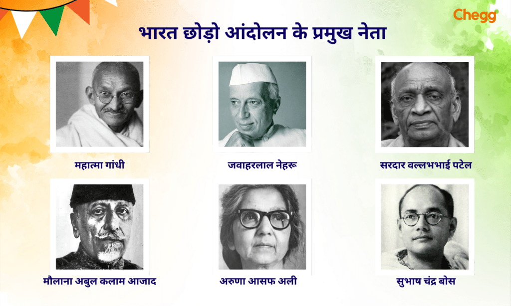 | महात्मा गांधी | भारत छोड़ो आंदोलन के मुख्य प्रेरणा स्रोत और नेता थे।उन्होंने “करो या मरो” का नारा दिया और लोगों को अहिंसक प्रतिरोध के लिए प्रेरित किया।सत्याग्रह आंदोलन का नेतृत्व पूरे देश में किया। |