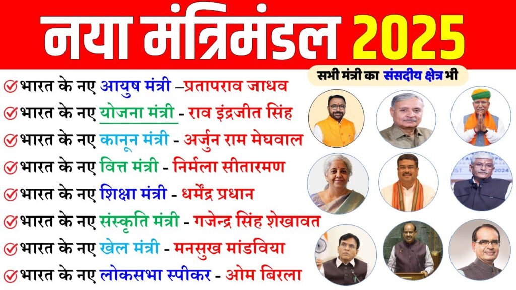 भारत के सभी मंत्रियों के नाम 2025 और उनके मंत्रालयों की जानकारी देश की शासन प्रणाली को समझने में सहायक है। यह सूची समय-समय पर अद्यतन होती रहती है, इसलिए नवीनतम जानकारी के लिए आधिकारिक स्रोतों का संदर्भ लेना चाहिए।