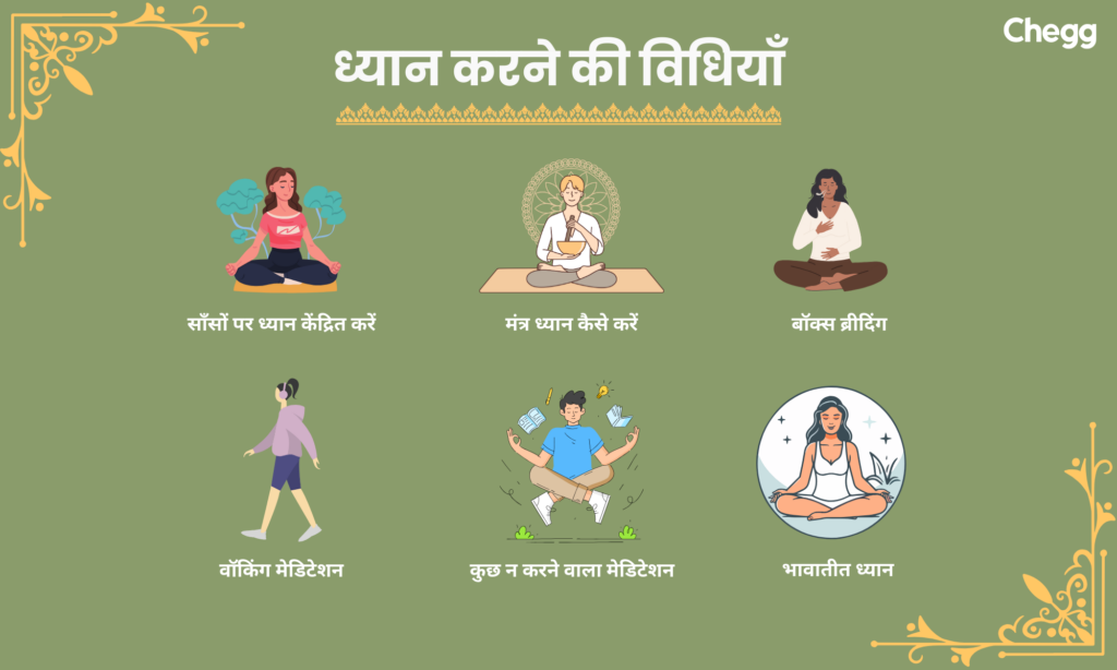 ध्यान करने के विभिन्न तरीकों में निम्नलिखित विधियाँ शामिल हो सकती हैं:
