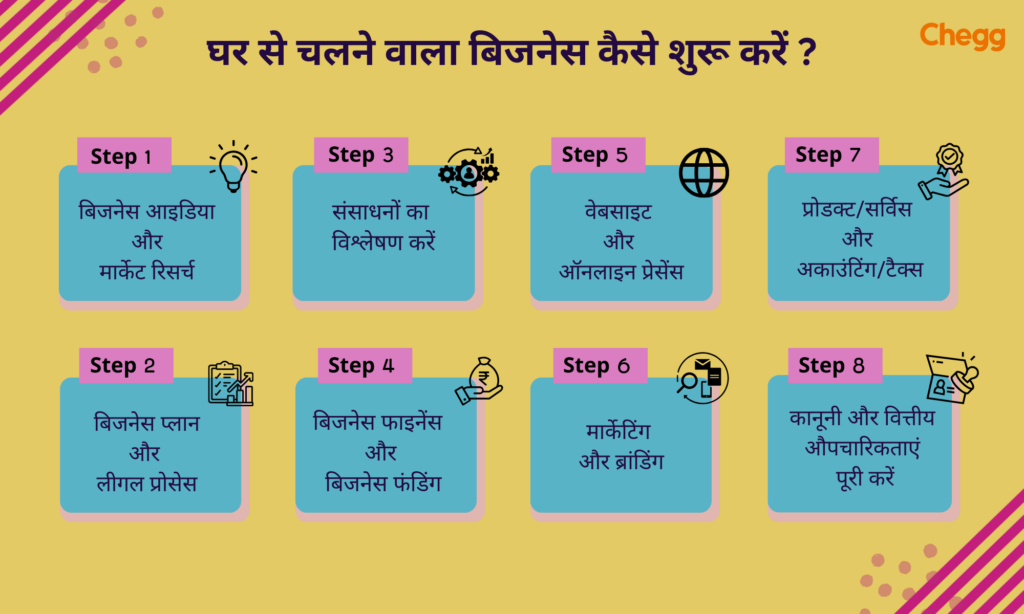 घर से चलने वाला बिजनेस शुरू करने के लिए कम से कम बिजनेस आइडिया, बिज़नेस प्लान, रिसोर्सेज, मार्केटिंग, ग्राहक सेवा और GST नंबर की ज़रुरत होती है।