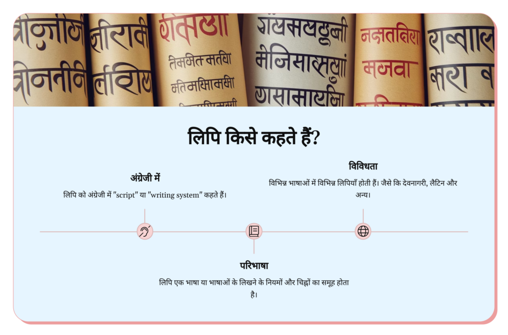 लिपि किसे कहते है? तो “लिपि” को अंग्रेजी में “script” या “writing system” कहते हैं। यह एक व्यक्ति या ग्रुप द्वारा उपयोग में लाये जाने वाले अक्षरों का समूह होता है जिनका उपयोग भाषा के लिखने और पढ़ने के लिए किया जाता है। विभिन्न भाषाओं के लिए विभिन्न लिपियों का उपयोग होता है, जैसे देवनागरी लिपि का उपयोग हिंदी और संस्कृत के लिए, लैटिन लिपि का उपयोग अंग्रेजी, स्पेनिश, फ्रेंच आदि के लिए होता है।