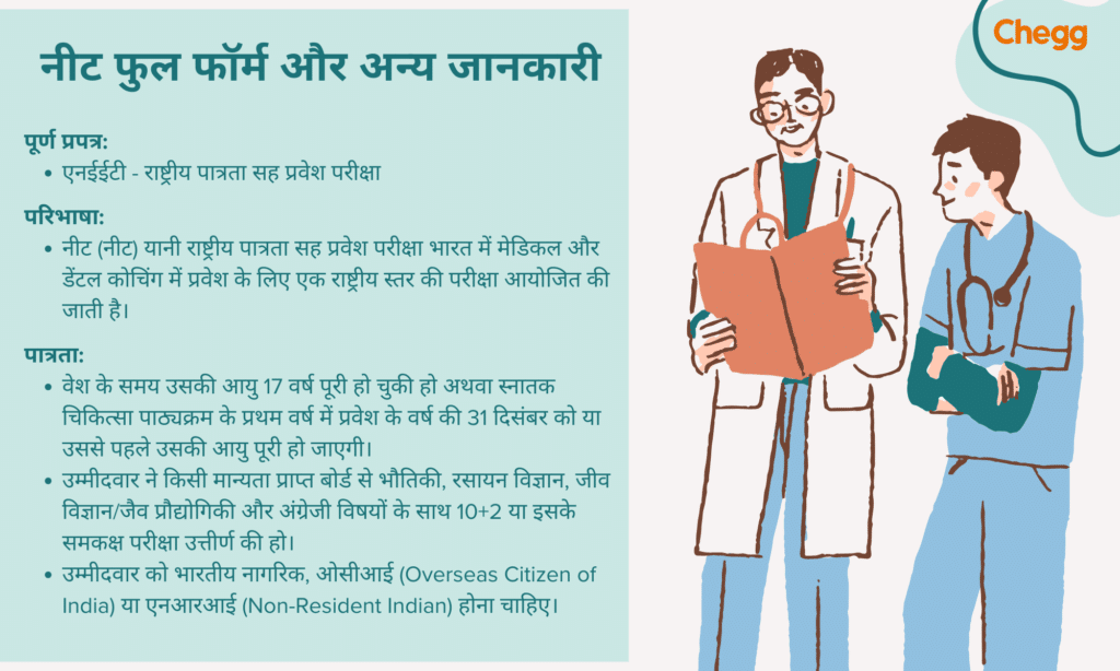सबसे पहले हम ये जानेंगे कि NEET kya hai | Neet ka Matlab kya Hota Hai? और नीट करने के फायदे कौन से होते हैं? दरअसल नीट (NEET), या नेशनल एलिजिबिलिटी कम एंट्रेंस टेस्ट, एक प्रवेश परीक्षा है जिसे भारत के मेडिकल और डेंटल कॉलेजों में प्रवेश के लिए आयोजित किया जाता है। इस परीक्षा का आयोजन नेशनल टेस्टिंग एजेंसी (NTA) द्वारा किया जाता है। नीट परीक्षा को पास करने के बाद, छात्र एमबीबीएस, बीडीएस, और अन्य मेडिकल कोर्सेज में प्रवेश पा सकते हैं।