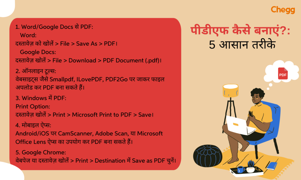 | Microsoft Word | 1. Word ऐप खोलें 2. डॉक्युमेंट बनाएं/खोलें 3. “File” > “Save as” > PDF चुनें | – प्रोफेशनल टेम्पलेट्स- Word से PDF |