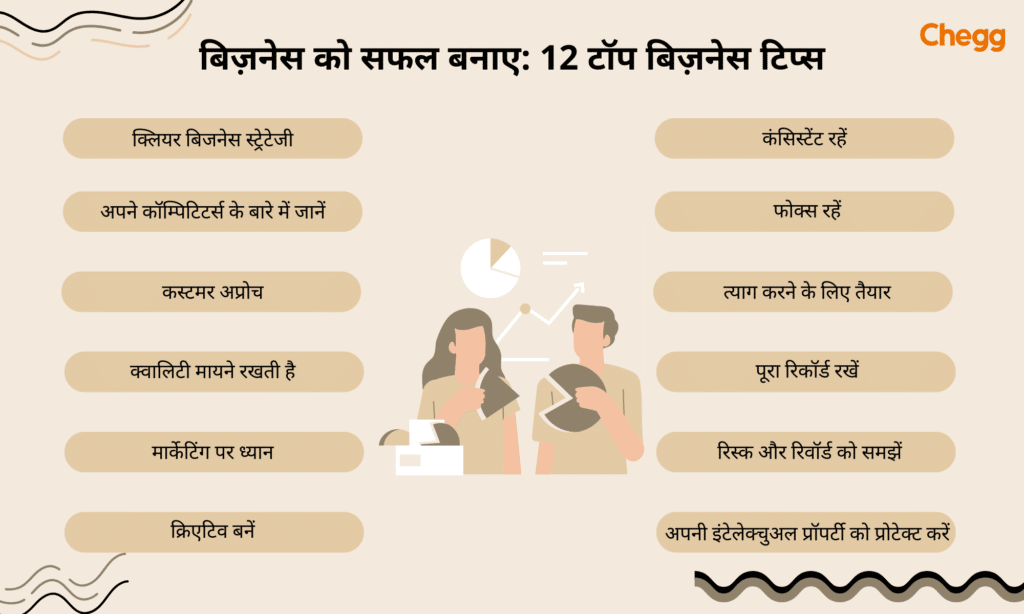 सबसे जरूरी बिजनेस टिप्स में क्लियर बिजनेस स्ट्रेटेजी, कॉम्पिटिटर्स के बारे में जानें, कस्टमर सेंट्रिक अप्रोच, मार्केटिंग पर ध्यान, क्रिएटिव बनें, कंसिस्टेंट रहें आदि शामिल हैं।