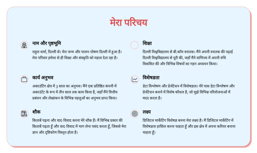 “मेरा नाम राहुल शर्मा है। मैंने कंप्यूटर साइंस में बी.टेक किया है और पिछले 3 साल से एक प्रतिष्ठित कंपनी में सॉफ्टवेयर डेवलपर के रूप में काम कर रहा हूँ।”