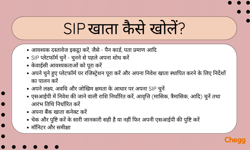 भारत में एसआईपी शुरू करने के लिए फाइनेंशियल गोल्स निर्धारित करने, सही म्यूचुअल फंड चुनने, एसेट मैनेजमेंट कंपनी चुनने, केवाईसी Compliance करने, एसआईपी पैसा चुनने, एसआईपी Frequency चुनने, एसआईपी आवेदन पत्र भरने, आवेदन जमा करने, Verification, निगरानी और Review करने की आवश्यकता होती हैं।